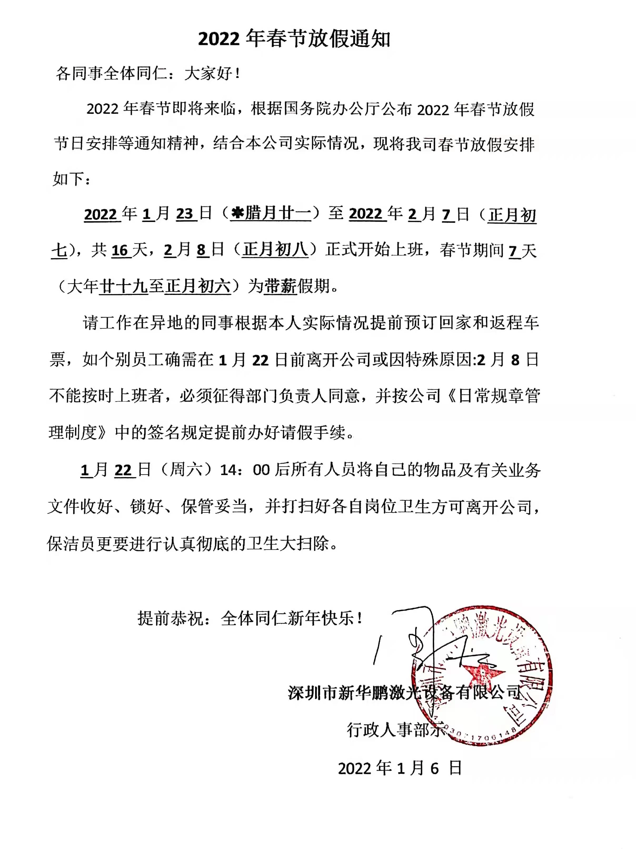 2022年春節即將來臨,根據國務院辦公廳公布2022年春節放假節日安排等通知精神,結合本公司實際情況,現將我司春節放假安排如下: