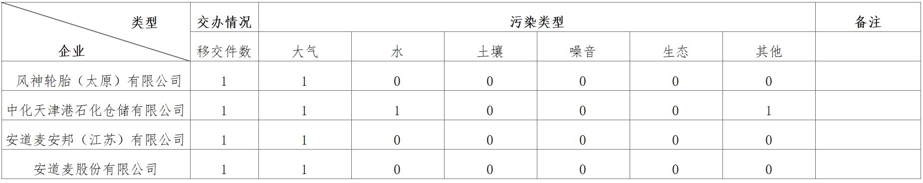 10月30日,中央第七生態環境保護督察組向中國中化控股有限責任公司轉辦第三批群眾信訪舉報件4件(來電舉報3件,來信舉報1件)。從信訪舉報件中的生態環境問題類型來看(一件舉報可能涉及多種問題類型),涉及大氣4件、水1件、土壤0件、噪音0件、生態0件、其他污染1件。從企業分布上看,風神輪胎(太原)有限公司1件、中化天津港石化倉儲有限公司1件、安道麥安邦(江蘇)有限公司1件、安道麥股份有限公司1件。