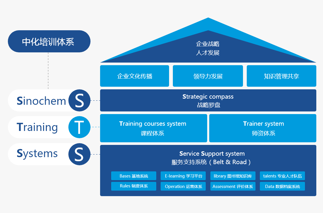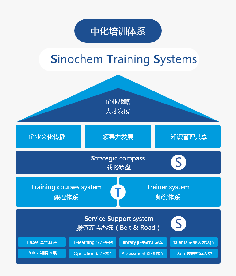 按照“面向全員,突出重點,分級負責,上下聯動,分類培訓,因材施教”的思路,構建科學系統的“中化培訓體系”(Sinochem Training Systems ,簡稱STS),著力抓好“兩高兩新兩專”(高級管理者、高潛質人才、新晉升人員、新入職員工、專業科技人員、專業職能人員)六大學習群體的教育培訓,完善管理、技術、技能三大人才發展序列,強化源頭培養、跟蹤培養、全程培養, 將職業生涯與教育培訓有機結合,建立健全培訓項目體系和學習發展地圖。