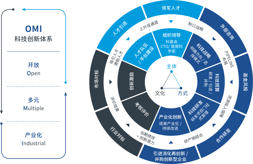 中國中化以“創新三角”為內核,緊密結合行業和產業發展階段的創新特點,形成開放(Open)、多元(Multiple)、產業化(Industrial)的OMI科技創新體系建設方案,加強頂層設計,重塑科技創新體系,著力增強自主創新能力,推動公司產業轉型和發展動能轉換。