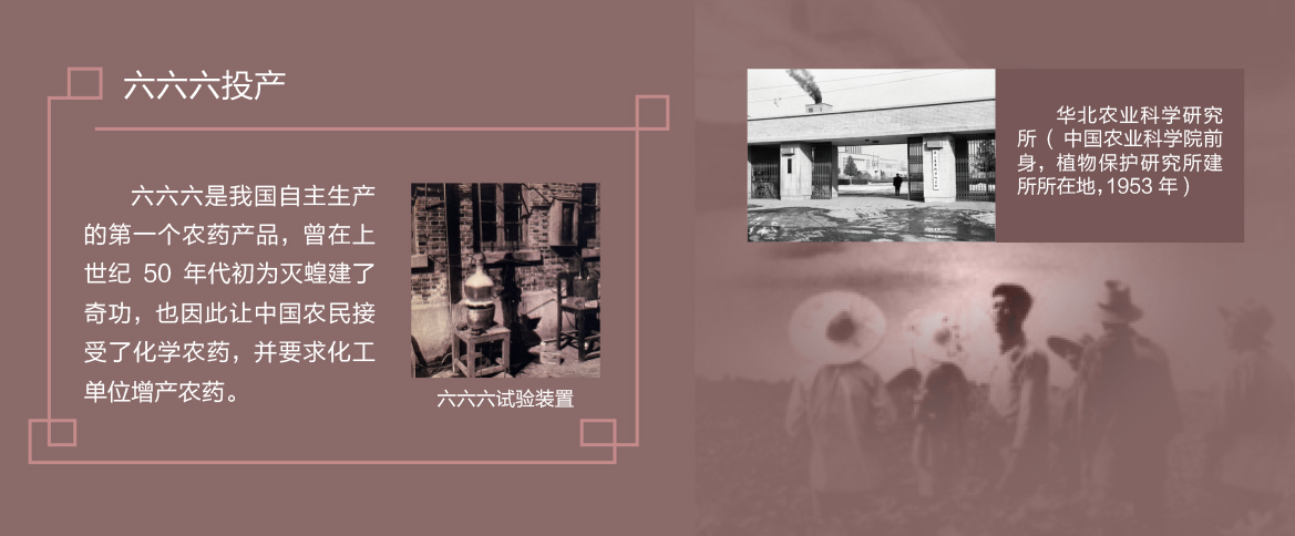 20世紀60年代,農民迫切要求增產農藥。1965年周恩來總理指示要像抓化肥那樣大抓農藥生產。華北農業科學研究所和上海病蟲藥械廠也先后研制成功有機氯農藥六六六,并于1951年投產。它標志著我國已經開創了自己的化學有機合成農藥工業。六六六是我國自主生產的第一個農產品,曾在上世紀50年代初為滅蝗建了奇功,也因此讓中國農民接受了化學農藥,并要求化工單位增產農藥。
