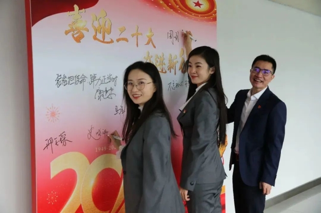 二是“移動課堂”,及時將黨的二十大報告主題展板在公司宣傳欄上展出,在公司過道及辦公區展示黨的二十大金句主題海報,并在公司公共區域屏幕上滾動播放會議精神宣貫視頻,確保會議精神入眼入腦入心。