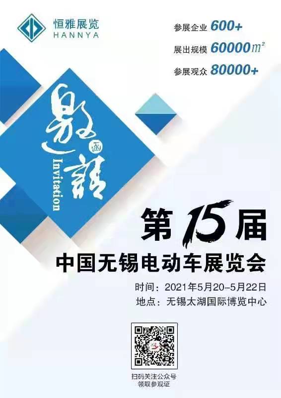 第15屆無錫國際電動車展覽會于2021年5月20日在無錫太湖國際博覽中心舉行,此次展會以“智能電動車 ,精彩無錫造”為主題,展品涉及到自行車、電動車(電動兩輪車、三輪、四輪)、電動摩托車及零配 件、小輪車和戶外運動裝備及用品,新能源電池制造設備(激光焊接生產線等),是國內重要的規模較大 ,技術先進,配套齊全的電動車展會之一。