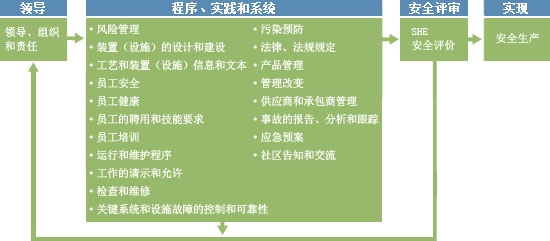 中國化工從體系建設(shè)入手,在原有的“兩標(biāo)一體(GB/T28001《職業(yè)健康安全管理體系規(guī)范》、GB/T24001《環(huán)境管理體系規(guī)范及使用指南》)”基礎(chǔ)上,吸收海外企業(yè)凱諾斯的成功做法和經(jīng)驗(yàn),結(jié)合信息化建設(shè),于2010年初步建成具有中國化工特色的SHE(安全、健康、環(huán)境)管理體系,為提升安全管理水平奠定了堅(jiān)實(shí)的基礎(chǔ)。