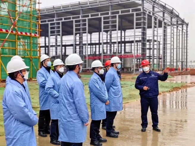 ▲在項目建設現場,了解新建電解液項目新工藝和總體進度