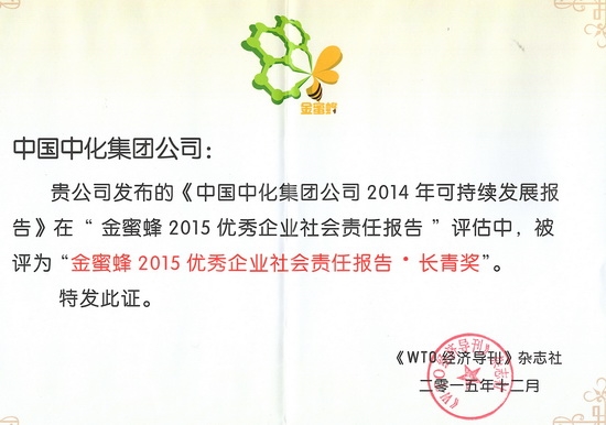 12月3日,在第八屆金蜜蜂中國企業社會責任報告國際研討會上,《中國中化集團公司2014年可持續發展報告》(以下簡稱“《報告》”)經過初評、復評、專家審核及首次增加的大眾評審環節,從2265份社會責任報告中脫穎而出,蟬聯“金蜜蜂優秀企業社會責任報告長青獎”(簡稱“金蜜蜂長青獎”),這是中化集團第三次獲得該獎項。