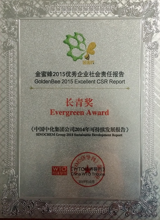 金蜜蜂長青獎是金蜜蜂報告榜的最高榮譽,連續3年獲得金蜜蜂獎且再次獲獎的企業報告會被頒發金蜜蜂長青獎,代表年度中國企業社會責任報告的最高水準,被舉辦方長期推薦,成為企業編制社會責任參考的典范和標桿。金蜜蜂評委認為,中化集團《報告》邏輯清晰,績效數據豐富,用封面主題故事、利益相關方感言、小化說和開篇小故事等為讀者打造輕松愉快的閱讀體驗,是一份體現企業特色、高質量的報告。