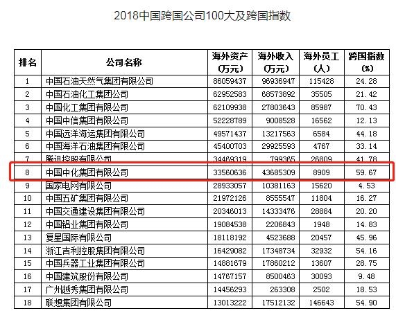 其中,中國中化集團有限公司位列“中國跨國公司100大”榜第8,跨國指數(59.67)位列第3。