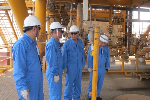圖為作者(左三)等在平臺上開展安全檢查工作。