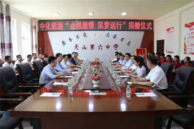 隨后,江正洪一行前往天山六中,與阿旗教育局和學校有關負責人就中化能源對天山六中的幫扶工作開展座談。江正洪代表中化能源向天山六中捐贈60萬元用于教師成長和校園建設項目。中化能源自2016年起對天山六中學生進行資助,并成立“中化能源班”開展精準幫扶。