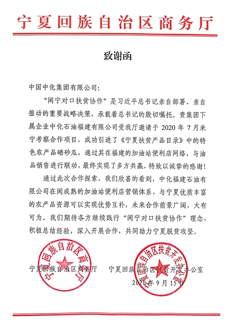 9月15日,寧夏回族自治區(qū)商務(wù)廳、寧夏回族自治區(qū)扶貧開(kāi)發(fā)辦公室向中化集團(tuán)發(fā)來(lái)致謝函,充分肯定中化石油銷(xiāo)售公司下屬福建石油公司為當(dāng)?shù)孛撠毠?jiān)所作努力,并致以誠(chéng)摯感謝。 致謝函中寫(xiě)道,“閩寧對(duì)口扶貧協(xié)作”是習(xí)近平總書(shū)記親自部署、親自推動(dòng)的重要戰(zhàn)略決策,承載著總書(shū)記的殷切囑托。中化石油福建有限公司受邀于2020年7月來(lái)寧考察合作項(xiàng)目,成功引進(jìn)了《寧夏扶貧產(chǎn)品目錄》中的特色農(nóng)產(chǎn)品硒砂瓜,通過(guò)其在福建的加油站便利店網(wǎng)絡(luò),與油品銷(xiāo)售進(jìn)行聯(lián)動(dòng),最終實(shí)現(xiàn)了多方共贏,特致以誠(chéng)摯的感謝!”