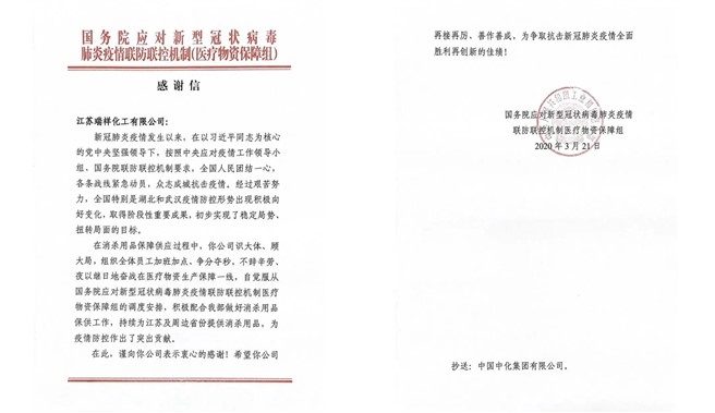 瑞祥公司作為蘇中地區唯一生產涉水次氯酸鈉的廠家,面對疫情發生后社會需求量的猛增,生產壓力倍增,公司調整原定大修計劃,當即成立“抗擊疫情先鋒隊”,組織了由專業技術人員、工段長和生產骨干參加的次氯酸鈉生產保障組和技術攻關組,開展現場裝置的隱患排查整改,通過換熱器的在線清洗等工作,延長設備的使用周期,對原料投放、配比、出料濃度和質量進行精準調節。瑞祥公司安排人員輪流值班、跟班,及時處理出現的各類問題,將生產產能提高了20%。累計為近300家單位免費供應可配置消毒劑2.6萬噸的原料次氯酸鈉130噸,緊急調配并提供30套一次性防化服和10套輕型防化服。疫情結束后,瑞祥公司收到國務院應對新型冠狀病毒肺炎疫情聯防聯控機制醫療物資保障組的感謝信。