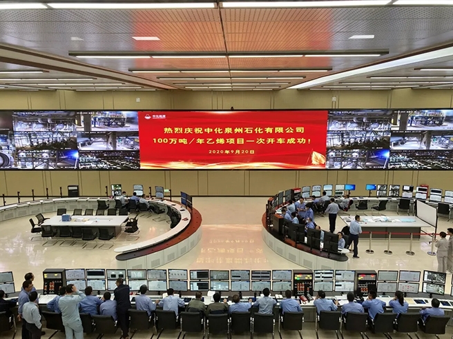 圖為2020年9月,中化泉州石化100萬噸/年乙烯項(xiàng)目一次開車成功時的中控室現(xiàn)場