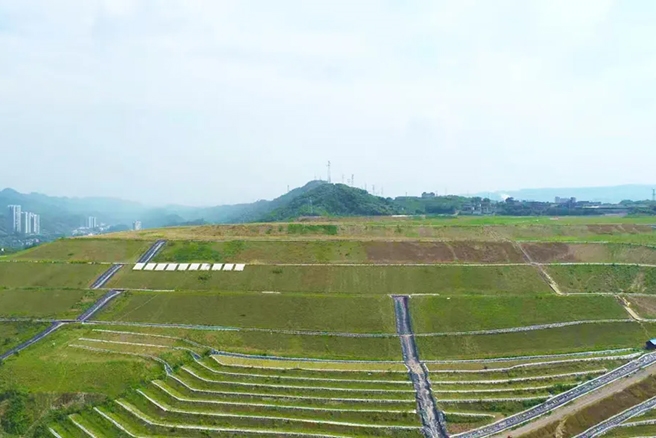 圖為經(jīng)過高標(biāo)準(zhǔn)治理的綠意盎然的中化涪陵磷石膏庫