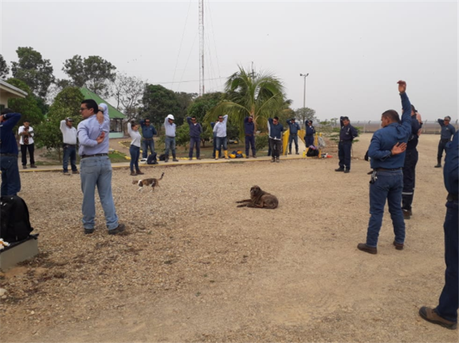 圖為Emerald哥倫比亞公司在室外召開的晨會和HSE交接會,人員之間保持2米距離