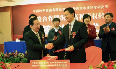1月5日,中種公司和岳陽市農科所戰略合作暨湖南洞庭高科種業股份有限公司(簡稱洞庭高科)股權轉讓簽約儀式在湖南岳陽市舉行。集團公司總裁助理張偉,岳陽市市委副書記、市長黃蘭香等出席簽約儀式。 通過收購自然人股東股權,中種公司與岳陽市農科所達成了戰略性、深層次的合作,實現了“產、學、研、用”相互結合。雙方將通力協作,將洞庭高科建設成為立足湖南,輻射長江中下游稻區的主要種業企業。 洞庭高科是依托岳陽市農科所水稻育種科研及科技成果優勢,于2004年成立的一家集育、繁、推于一體的種業企業,是全國種業50強企業,其優質稻品種“岳優9113”在南方8省、區廣泛推廣應用,種植面積居全國單一晚稻品種首位。