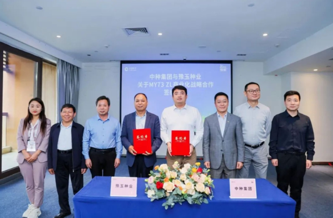 中種集團此次發布的新品牌,旨在整合旗下多項先進生物育種技術,為行業提供更系統、更高效的解決方案。依托品牌背后的研發實力,新品牌所覆蓋的產品和性狀可有效提升作物產量,減少化學農藥使用,幫助種植者降低種植成本。 優質性狀共享? 玉米單產提升示范 為進一步匯聚雙方優勢資源,向市場提供優良性狀、高產、適應性強的玉米品種,在此次論壇上,中種集團與河南省豫玉種業股份有限公司(以下簡稱“豫玉種業”)舉行戰略合作簽約儀式。