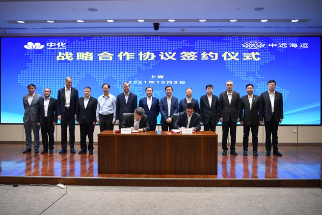 10月8日,中國中化控股有限責任公司(簡稱“中國中化”)與中國遠洋海運集團有限公司(簡稱“中遠海運”)簽署戰略合作協議。中國中化董事長、黨組書記寧高寧,董事、總經理、黨組副書記李凡榮;中遠海運董事長、黨組書記許立榮,董事、總經理、黨組副書記付剛峰出席并見證簽約。中國中化副總經理陽世昊、中遠海運副總經理黃小文分別代表雙方簽約。 簽約儀式前,雙方就深化合作事宜進行了深入交流。