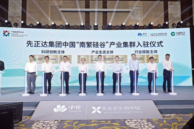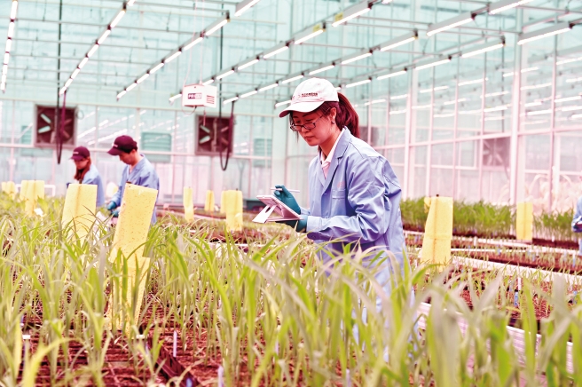 楊凌技術中心科研人員對回交轉育流程中的玉米進行植株表型調查 楊凌技術中心于2019年9月啟動建設,是中國中化下屬先正達集團在陜西楊凌示范區投資建設的全球領先的商業化育種創新平臺。 在傳統育種模式下,育種大多靠“拆盲盒”,需要通過觀察性狀的田間表現,不斷地篩選、組合,周期漫長,且充滿偶然性。但在楊凌技術中心,育種專家通過分子檢測技術,可以精準預測育種材料是否具備想要的性狀,再經相較傳統育種少得多的若干輪測試,最終選育出新品種。 楊凌技術中心的高通量分子檢測平臺,具有檢測能力高、檢測速度快等特點。該平臺支持從研發、生產到銷售“端到端”的技術支撐,已實現每年數千萬數據檢測通量,單日檢測通量達數十萬。 楊凌技術中心還打造了轉育通量和速度國內領先的生物育種性狀快速整合平臺,每年可實現4至5代的“迭代”能力,超過國內行業每年2至3代的平均水平。其中原創的單倍體耦合基因編輯技術,僅用1至2代便可完成目標品種的性狀改良。 育種能力的躍進關鍵在于育種精準度和效率,楊凌中心雙單倍體工廠化生產平臺、高通量分子檢測和生物育種性狀快速整合等領先技術,使育種精準度越來越高,效率越來越好,大幅縮短育種時間和流程。 近年來,為加快新品種開發和推出速度,中種集團不斷完善其創新平臺布局。在研發端,建成包括兩大國家級實驗室,以及北京創新中心、武漢科技中心、三亞南繁中心、水稻玉米生物育種重點實驗室、雜交稻新品種創制重點實驗室等一批研發機構,構建了分工協作的種業現代共享技術研發體系。在選育端,依托楊凌技術中心集成化、工廠化育種平臺能力的同時,布局各級測試驗證網絡,打通從實驗室到田間的育種“高速公路”。在擴繁推廣端,聯合多地政府打造區域現代供應鏈中心,并致力于良種良法結合,為發揮優良品種潛能提供一體化解決方案。 堅持科技自立自強 加強良種技術攻關 2021年5月13日,習近平總書記在河南考察時講話強調,要堅持農業科技自立自強,從培育好種子做起,加強良種技術攻關,靠中國種子來保障中國糧食安全。 近年來,中國中化不斷突破關鍵核心技術,為大面積提高糧食單產提供良種支撐,實現種業科技自立自強。2023年,公司下屬先正達集團中國共有130個品種通過國家審定,穩居行業前列;9個品種入選2023年全國農業主導品種;16個品種入選“國家農作物優良品種推廣目錄”……一系列創新成果凸顯出強勁的科研育種實力。 今年2月,在由國家自然科學基金委員會主辦的2023年度“中國科學十大進展”遴選活動中,先正達集團中國參與聯合攻關的科研項目“農作物耐鹽堿機制解析及應用”榮列其中。 我國有15億畝鹽堿地未被有效利用,其中約5億畝有開發利用潛能,當前對植物耐鹽堿的認識嚴重不足,阻礙了耐鹽堿作物的培育。為了更好地利用鹽堿地資源,研究團隊利用起源于非洲撒哈拉高鹽堿地的高粱自然群體材料定位克隆到一個與耐堿性顯著相關的主效基因AT1,該基因可顯著提高高粱、水稻、小麥、玉米、谷子等作物在鹽堿地上的產量。作為迄今為止我國作物高抗鹽堿能力研究領域的重大國際性突破,該研究發現將為鹽堿地綜合利用提供新基因、新種質和新途徑。目前,研究團隊已經在山東、寧夏、吉林等地開展相關品種的測試與篩選工作。