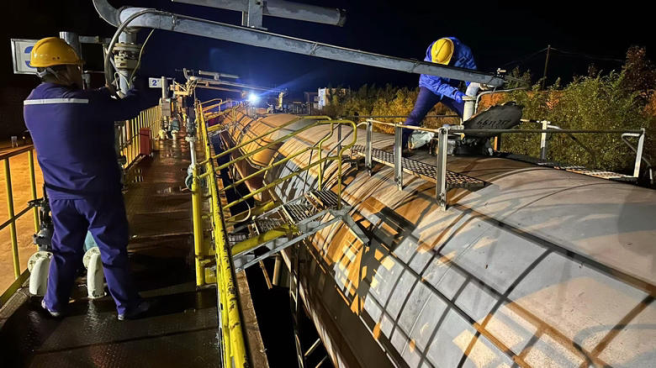 中化東北石油 國慶期間,中化東北石油油庫班組奮戰(zhàn)在油品接卸一線。班組人員嚴(yán)格遵循操作規(guī)程,插好鶴管,蓋好滅火毯,啟泵后時刻觀察壓力和液位變化,確保作業(yè)安全。
