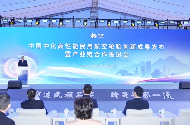 中國中化高性能民用航空輪胎創新成果發布暨產業鏈合作推進會現場 11月23日,中國中化高性能民用航空輪胎創新成果發布暨產業鏈合作推進會在桂林召開。大會宣布我國首條民航輪胎生產線全面建成投產,我國唯一復雜工況航空輪胎起降測試平臺面世,并發布12款具備完全自主知識產權、可覆蓋國內80%民航機隊輪胎規格的創新產品。這在民用航空輪胎國產化進程中具有里程碑意義。 廣西壯族自治區副主席胡帆,中國中化董事長、黨組書記李凡榮,中國商飛董事長、黨委書記賀東風,中國工程院院士、西安交通大學校長張立群,桂林市市長李楚,國務院國資委、工信部有關司局負責同志,以及中國民航中南地區管理局、中國國航、南方航空、東方航空等航司相關負責人出席會議。中國中化副總經理、黨組成員、首席技術官張方主持會議。