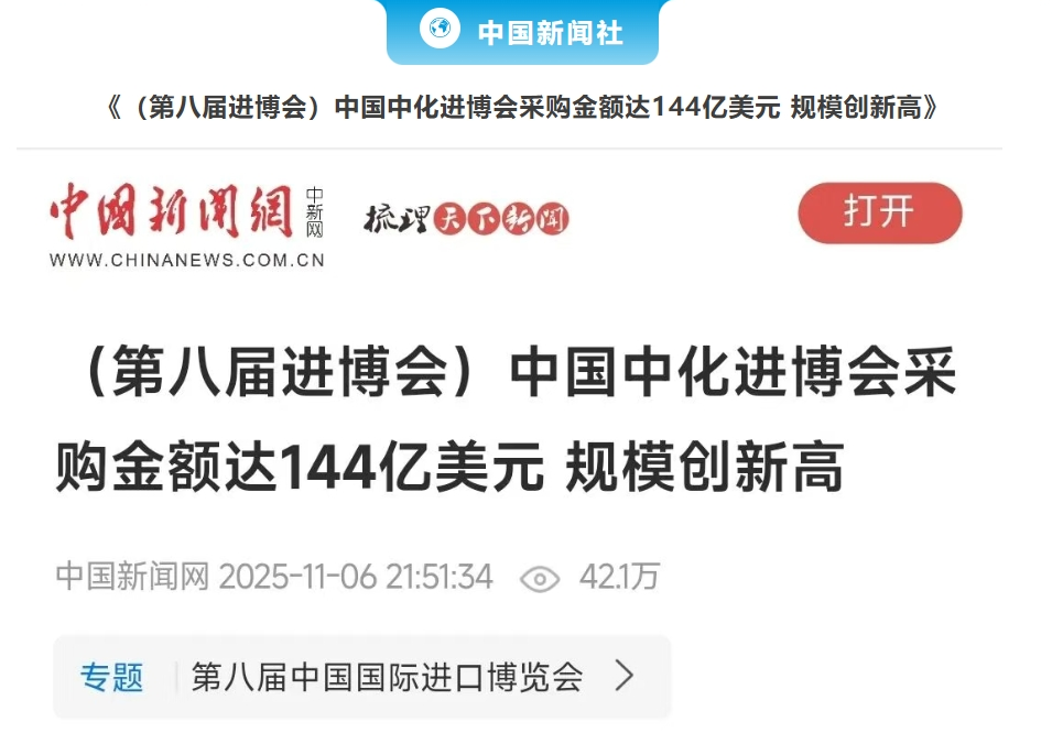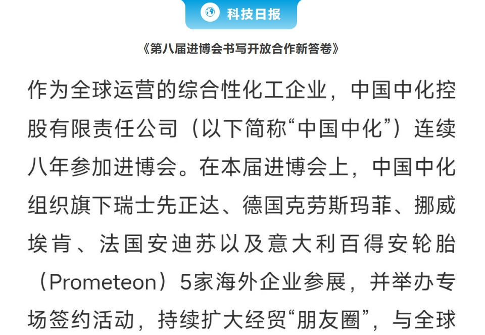 日前,第八屆中國國際進口博覽會正式落下帷幕。在進博舞臺上,中國中化與全球合作伙伴深化互信、加深合作,攜手共享中國發展機遇,開放競進、不斷突破,以卓越創新驅動新質未來。 進博會期間,中國中化創新成果獲得眾多媒體廣泛關注與報道。