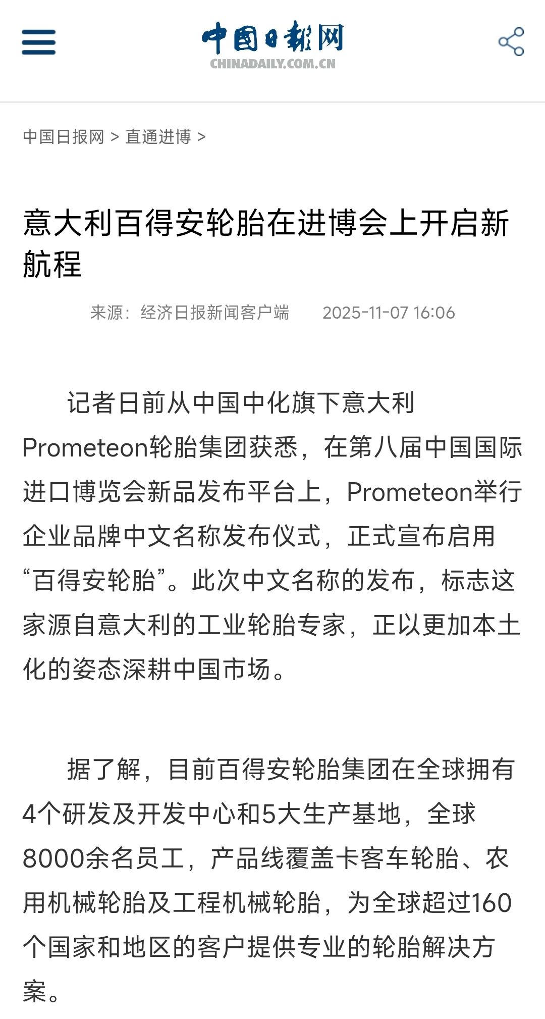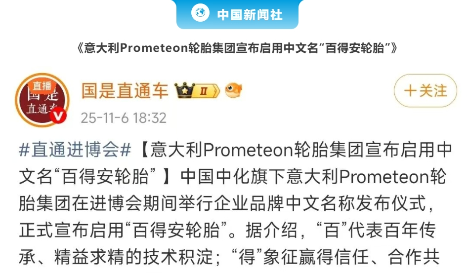 第八屆進博會期間,中國中化旗下意大利Prometeon輪胎集團發布更有“中國味道”的企業品牌中文名稱“百得安輪胎”。百得安輪胎集團亞太區質量負責人穆云龍接受央視采訪時表示,此次參加進博會,百得安輪胎集團帶來了適用于農機、礦卡、新能源公交等領域的各類型輪胎,將深度參與到中國的發展中。
