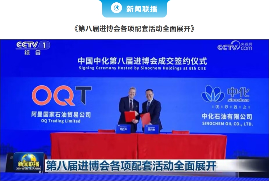 CCTV-1《新聞聯播》報道第八屆中國國際進口博覽會各項配套活動全面展開。中國中化第八屆進博會成交簽約儀式畫面亮相央視。 在簽約儀式上,中國中化與來自沙特阿拉伯、阿曼、哈薩克斯坦、法國、日本、韓國、比利時、馬來西亞、莫桑比克、泰國等10余個國家和地區的近20家企業簽訂采購合作協議,在原油與成品油、食品和農產品、化工產品、化工裝備、服務貿易等多個領域深化合作,采購總額達144億美元,再創歷史新高。