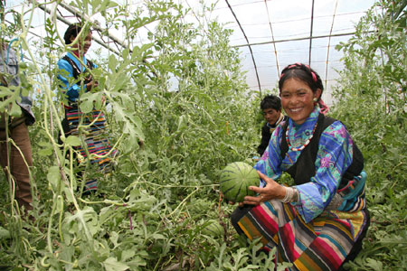 《中國西藏》雜志 2006年第4期 拉巴種植的西瓜喜獲豐收 根據中央的部署,2002年7月,中化公司對西藏日喀則地區崗巴縣實施對口支援。近四年來,中化公司共派出兩批援藏干部進藏工作,已投入援藏資金2100多萬元。 崗巴,藏語的意思是雪山附近之村莊,地處喜馬拉雅山脈北麓的崗巴縣,平均海拔 針對崗巴自然環境較差,人口少、居住分散,特別是農牧民缺乏致富技能等情況,為從根本上幫扶廣大農牧民擺脫貧困、增收致富,切實推動崗巴縣經濟、社會的全面發展,使援藏工作見實效、見長效,中化公司的援藏人員從探索和創新援藏模式入手,確立了“工程援藏與智力援藏相結合,推動經濟發展與轉變思想觀念相結合”的”二結合”援藏工作方針,把引領農牧民增收致富作為援藏工作的出發點和落腳點,把培養農牧民增強致富技能作為援藏的一項重要工作來抓。幾年來,通過多渠道、多層面實施培訓,崗巴縣已有一批農牧民徹底改變了原來的生產方式,不僅現金收入大幅度增長,而且擁有了持續增收致富的技能。 平措和拉巴夫婦是崗巴鎮雪村的農民,一家三口人過去只靠2.3畝土地種植青稞維持生活。 2005年,雪村的溫室大棚擴建為15座,雪村15戶農民在技術員的指導下用溫室大棚種植蔬菜,年均收入10000元以上,最高的一戶達15000元。 在海拔4700多米的地方種植蔬菜,不僅使部分農牧民率先走上致富道路,更重要的是使更多的人看到了致富的希望,給當地農牧民帶來了觀念上的改變,商品經濟的意識已經悄悄深入人心。在蔬菜大棚基地的旁邊,幾個藏族婦女正在鋪塑料薄膜,她們說看到種菜給鄰居們生活帶來的變化,很羨慕,也想試看學種菜。我問技術員宋延玲一共教了多少個學生, 旦巴平措在認真的學習藏族傳統繪畫 2005年10月,經中化公司援藏人員與日喀則職業中專學校接洽,該校專門為崗巴縣開辦了一個藏族傳統繪畫班,僅半年多的時間,參加學習的9個孩子已經能跟隨老師外出做室內外繪裝的活。在日喀則市崗多林波姆切居委會群培家里,記者看到了孩子們和他們的繪畫老師邊巴剛剛完成的作品,在這個藏式風格濃郁的院落里,繪滿了不同風格的吉祥圖案,雕梁畫棟、金碧輝煌。簡直不敢相信這里的部分畫作出自幾個月前還對繪畫一竅不通的孩子們。根據老師的介紹,學員畢業第一年到蓋房人家作畫,除管吃管住外,每天至少有30—40元的報酬,年收入在6000—7000元左右。以后出師后自己還可以帶徒弟,那時候收入每天可以達到100多元。 由于傳統的以一家一戶為生產單位及自給自足的生產方式造成的對勞動力的束縛,中化公司在崗巴縣實施培訓項目之初,每開展一個培訓項目時,都需要縣委、縣政府及有關部門進行大量的宣傳說服工作,有的甚至要挨家挨戶進行動員。自從大棚蔬菜上市及學習繪畫的學生利用假期在本村、本地開展有償服務以來,農牧民親眼看到了通過技術學習所帶來的實惠,學習技術的熱情隨之提高。2006年初,培訓木工報名通知由縣政府發至各鄉鎮后,報名者多達20名,超過了以往任何一個培訓項目的報名人數。為了鼓勵農牧民學習技術的積極性,中化公司援藏干部決定將這20名報名者全部送到西藏剛堅家具廠進行培訓學習。 木工班的學員們在西藏剛堅家具廠學習裝配家具 通過培訓讓廣大農牧民根據自身特點和愛好學到一門技術,從而拓寬增收渠道,增強致富能力,這一點已在中化公司援藏人員和崗巴縣廣大干群中取得了廣泛認同。為使這一觀念長期貫徹下去,形成一種長效機制,2004年崗巴縣成立了一個專門負責組織和管理培訓事務的崗巴縣培訓工作部,并設計制定出了技能培訓、素質培訓、助學金計劃三條面向全體崗巴縣干部職工和廣大農牧民的學習渠道及平臺,使培訓工作成為一項重要的對口援藏項目。 技能培訓是緊緊圍繞廣大農牧民生產、增收、創業開展的培訓,以期讓部分群眾從種地,放牧,打工等低收入的生產、生活方式中脫離出來,提高勞動技能,增加收入;素質培訓主要面向縣、鄉、鎮機關、事業單位和公共服務機構的人員,以短期專業學習、專業培訓及安排參觀和到對口單位實踐等方式,培訓其管理能力、專業水平、服務意識和市場經濟理念;助學金計劃的主要對象是崗巴縣的初、高中畢業生,以到內地中、高等職業學校學習為主,學習時間2-3年,最終取得中等或高等學歷。通過以上三個方面的培訓,一是使一批有能力、有意愿從事第二、三產業和養殖、種植業人才脫穎而出,使他們在個人致富的同時,帶動廣大農牧民共同致富,促進當地群眾思想觀念的轉變;二是不斷提高政府機關、機構為廣大農牧民服務的能力和水平;三是為崗巴縣培養一批具備較高素質的人才,改善當地的人才結構,為經濟的持續發展奠定人才基礎。 目前,中化公司在西藏和內地共建立了7個培訓點,在學和已學成畢業學員80多名。 日喀則職業中專學校,專業有藏族傳統繪畫、藏醫學,獸醫,護理、計算機等。目前在該校各專業學習的學生共20名。 西藏剛堅家具廠,從崗巴縣4鄉1鎮選拔出的20名農牧民正在該廠學習木工和家具繪飾。 日喀則地區人民醫院,目前有4名崗巴縣醫院醫生在該院學習骨科、CT、B超和放射。 江孜縣人民醫院,2004—2005年,有6名崗巴縣醫院醫生在該院分別學習外科、麻醉、計生和護理。通過學習,現在崗巴縣醫院已可以開展簡單手術,結束了崗巴縣凡手術必到