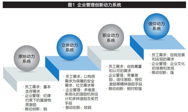 導語:企業創新發展的“動力系統”,旨在以科學合理的“外部刺激”,最大限度滿足員工的“內在需求”,最大可能激發員工的“動機”,從而產生工作的“動力”,推動企業的創新發展。 創新之道,唯在得人。根據心理學的觀點,人的行為通常都是由某種動機引起的,而形成動機的條件不外乎兩個方面:一是內在的需求,二是外部的刺激。兩者之間,相輔相成,相伴相生。而企業要充分發揮人才作為創新第一資源的引領和支撐作用,就需要以科學合理的“外部刺激”,最大限度滿足員工的“內在需求”,最大可能激發員工的“動機”,進而產生工作的“動力”。因而,企業創新發展需要打造科學的“動力系統”。以系統支撐發展,方能力引而不竭。 按照滿足內在需求的不同和創新能力的高低,可以將企業創新的動力系統歸納為四個具有遞進關系的類型,包括原始動力系統、立體動力系統、職業動力系統和信仰動力系統。如圖1所示。