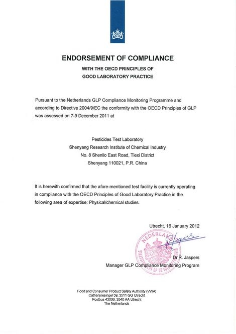 沈陽化工研究院農藥檢驗實驗室通過經合組織OECD成員荷蘭政府GLP認證認可