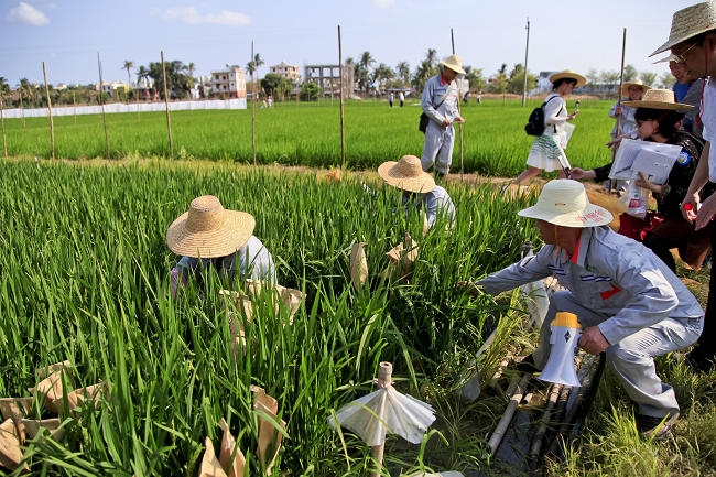 圖為育種家在田間地頭向網絡名人、網媒記者介紹育種的技術細節 在田間地頭,網絡名人、網媒記者和微博網友與育種家們就南繁基地發展情況以及選育的水稻品種進行了溝通和交流。大家了解到,作為我國唯一的國家級育繁推一體化農作物種業企業,中種公司是1978年經國務院批準在原農林部種子局基礎上成立的我國第一家種子企業,經過三十余年發展,現已成為集科研、生產、加工、營銷、技術服務于一體的產業鏈完整的大型種業集團。中種公司自1978年起在海南設立分支機構,開展南繁育制種,目前基地面積已達南繁面積的10%以上,成為南繁育制種的主力軍。 這是真正的體驗之旅 育種是個辛苦活,育種家被稱為“拿工資的農民”。在育種田里,網絡名人、網絡記者和微博網友穿上膠鞋、帶著草帽,走進田間,在育種家們的指導下,親身參與了插秧活動,并體會到了農事活動的艱辛和不易。