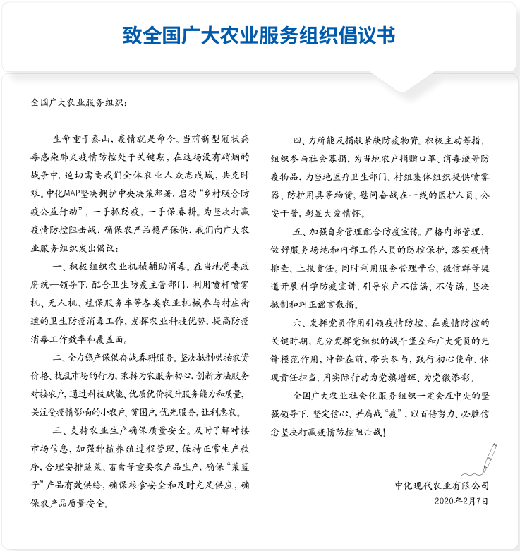 農業事業部倡議:開展“鄉村聯合防疫公益行動” 為進一步加強對農村疫情防控的支持,中化農業牽頭,聯合揚農集團,并組織MAP朋友圈的各龍頭植保機械企業,共同啟動“MAP鄉村聯合防疫消殺公益項目”,為疫情核心地區湖北省等地鄉村公共區域開展集中消毒作業,旨在助力補齊重點區域鄉村防疫工作短板。2月11日下午,國務院組織召開“聯防聯控機制新聞發布會”,會上農業農村部農村合作經濟指導司毛德智副司長在回答央視記者關于社會力量參與防疫工作的提問時,點名肯定中化農業MAP向全國農業服務組織發出的倡議,以及通過開展“MAP鄉村聯合防疫公益行動”動員社會力量組織農村防疫消毒作業的做法。