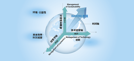 新興技術和業務發展辦公室組織架構 KAITEKI經營是三菱化學獨創的經營體系,具體由經濟管理(MOE)、技術管理(MOT)和可持續管理(MOS)三大管理軸線共同構筑。MOE致力于提高財務價值,推進實現公司資本效率的最大化;MOS是始終以高度的倫理觀念和社會良知,致力于提高人與社會、地球的可持續發展;MOT是追求面向社會的技術創造創新,充分利用自己的技術優勢,向社會提供具有國際競爭力的優質技術和產品。這3種經營過程中產生的價值也被稱為“KAITEKI價值”。