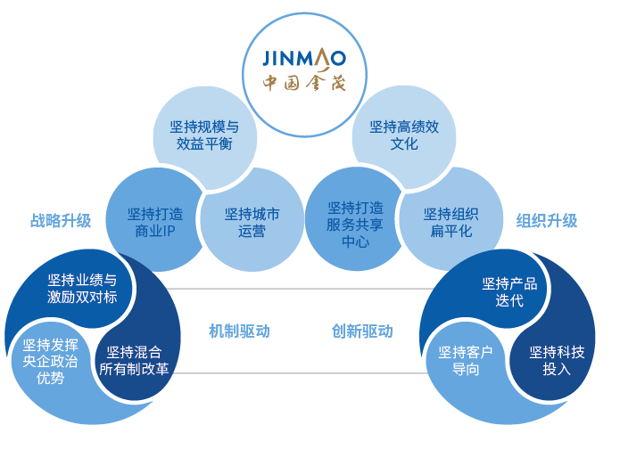 第一,創新驅動。 堅持客戶導向。企業核心價值點是微笑曲線的兩端,一端就是客戶,我們將不遺余力完善客戶研究體系,著力打通設計、營銷、客服界面,并堅定圍繞客戶開展工作,做到“總部以區域為中心,區域以項目為中心,項目以營銷為中心,營銷以客戶為中心”。 堅持科技投入。微笑曲線的另一端是研發,我們未來5年內投資50億孵化30個具有獨角獸潛質的企業,加速向科技驅動的創新型企業轉變,通過“極創翼”平臺機制拉通客戶跟研發之間關系,借助PE并購和孵化器方式,圍繞大科技、大文化、大健康三個方向實現突破。 堅持產品迭代。我們將堅持客戶推動、技術驅動的產品迭代原則,重點做好金茂府2.0迭代升級,以及“以城聚人、以城促產”的城市運營模式升級。 第二,機制驅動。 堅持企業混合所有制改革。我們將以全面市場化為目標,加速推動公司混合所有制改革進程。 堅持業績與激勵的雙對標。在堅持業績對標基礎上,全面推行激勵的對標,真正做到激勵與業績掛鉤,能上能下、能高能低。具體而言,我們將要求公司職能部室對標行業相應條線優秀企業、各區域對標轄區內的競爭優勢企業,各專業平臺對標本業務龍頭企業,各項目對標項目周邊同類型績優項目。 堅持發揮央企的政治優勢。強化黨的領導,積極踐行國家戰略,把黨的政治優勢轉化為公司核心競爭力。 第三,戰略升級。 堅持規模與效益的平衡。我們更加強調基于效益優先的規模增長,追求滿足品質領先要求的“快周轉”,公司簽約額要盡快突破2000億,進入行業第一梯隊,同時毛利率保持在30%以上,推動市值十年內翻兩番。 堅定不移地打造商業IP。舉全司之力打造商業IP,將“覽秀城”打造成業內高水準產品,形成綠色、智慧、體驗、創新等品牌特色,并通過城市運營、并購和舊改加快覽秀城布局,逐步達到行業標桿水平。 堅持城市運營商的戰略。繼續以“12361”體系指導城市運營發展,到今年年底實現累計獲取及鎖定城市運營項目20個,未來新增土地儲備中城市運營項目占比逐步提升至60%,減少土地市場招拍掛拿地,實現跨周期的資源獲取。 第四,組織升級。 堅持打造服務共享中心。繼續優化組織架構,在堅持總部重大決策中心、資源配置中心、共享服務中心和一線助力中心定位的基礎上,將大部分總部職能打造成為服務中心,做實服務型總部。 堅持組織扁平化。堅持三級構架、兩級管控,做到“有人干、有人看”,如果“有人干、多人看”便會出現矛盾與問題。項目上堅持實行三部六崗制,同時應用十步流程法,保證所有流程不能超過十步。 堅持高績效文化。傳承集團高績效文化,堅持永找不足,精益求精,形成能上能下、能進能出、獎優罰劣、優勝劣汰等良好組織氛圍。 通過深入對標反思,中國金茂當前在規模與效益、長期與短期、機制與管控等方面都存在不平衡、不充分的地方,我們要堅持以“品質筑就更美生活”為使命,堅定“2212”發展戰略,落實具體行動措施,爭取早日邁入行業第一梯隊。 堅持企業混合所有制改革。我們將以全面市場化為目標,加速推動 公司混合所有制改革進程