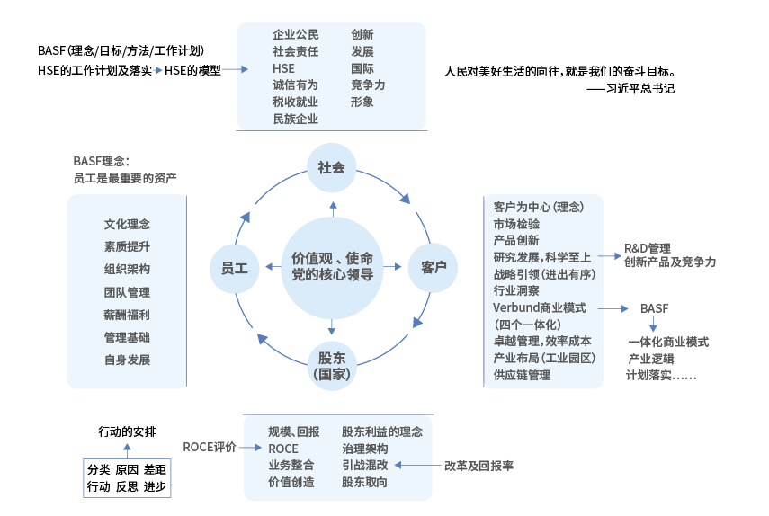 第二,客戶。 客戶就是市場,這是最終檢驗我們的一個關口、一個標準。這一關過不去,企業肯定要完蛋。先有觀念,再說行為,客戶這方面也是一樣,我們要先樹立一個理念,即“以客戶為中心”。從這個理念出發,可以延伸出市場檢驗、產品創新、研究發展、科學至上、戰略引領、行業洞察、一體化商業模式、卓越管理、效率成本、產業布局、供應鏈管理等多個方面。 其中,戰略引領包含兩個層面。第一個層面是公司資產組合戰略,即進出有序、行業洞察,也就是不斷調整資產組合,不斷適應市場對行業的需求;第二個層面是企業競爭戰略,比如說一體化,行業確定之后可以做一體化、降成本、做研發、做好產品,這些都是企業競爭戰略。 關于一體化大家這兩天討論很多,巴斯夫的一體化戰略就做得很好,路德維希幾乎占了巴斯夫的一半,巴斯夫中國占巴斯夫全球的百分之十幾,在中國他們要再建一個升級版的路德維希港,100億美元預算,2026年要建成。一體化包括了產品、研發、市場、信息、資產組合一體化,具體來說,上游、下游怎么做,銷售怎么做,研發怎么做,生產上下游、銷售渠道、研發怎么聯合,信息系統怎么聯合等等,在這里面就有價值創造,協同效應也就出來了。 這次我們討論比較多的是業務整合問題,業務整合絕對不是簡單相加,一定是化學整合,不是物理整合,一定是發生了化學反應,產生有機聯系,不是簡單的相加,這是一個新的商業模式。 今天上午,金融和地產組也運用這些方法很好地分析了自身,逐步形成很多很好的管理方法。一法通,萬法通。企業管理的方法都是相通的,真正領會把握了,去做其它行業也照樣可以,邏輯是一樣的。 關于產業布局,我們之前討論產業園區的出發點往往是安全問題,覺得產業園區投資很大、不好管理。但通過討論,我們越來越明確產業園區的確有一體化的技術邏輯、效率提高、戰略創新在其中。未來,隨著小型化工企業的逐步關停,安全管理水平高、產值高、技術水平高的化工園區將成為趨勢。 今天的分析,為我們下一步怎么做帶來了很好的理念和方法,等到明年這個時間再開會,我們會針對每一個點形成反思和行動。比如行業洞察怎么做?可能會把當時涉足的所有行業都列出來討論,再去看這個行業我們還需不需要,是需要擴大或減少,以及要去投資什么新行業。 過去我們的投資有很多是相對被動的,別人想賣給你,你再去買,這叫投行驅動型的投資,投行做一個牽線搭橋的角色。至于這個資產是不是符合我們的戰略、符合市場,發展趨勢如何,這些就不一定了。這就是一個機會性的投資,我們試圖把它搞成戰略性投資。而下一步,我們將主動進行戰略型投資,大方向確定了、行業確定了,我們主動找到他們去購買,或者自己干。 從客戶本身來講,MBA所教的大部分企業管理課程都在這兒了。但這里面也有我們對標巴斯夫著重提出來的幾點,這里面可以根據重要性進行排序,并制定落實方法,做好這個模型后,以后每年過一遍,什么地方漏了,哪些還沒做好,我們就心中有數了。 第三,股東。 股東,在管理課程里講得比較少,大多不把它當成管理邏輯的一部分,但股東這點對我們來說很重要,因為國家、所有制的要求幾乎決定了我們所有的行為。 作為國有企業,國家是大股東,當然也有小股東、合資股東。股東利益包括了規模、回報、ROCE(已動用資本回報率)、業務整合、治理架構、引戰混改等諸多因素。我再次強調ROCE這個概念,它體現了占用的社會資源。特別是國有企業,幾乎所有占用的錢都可以被認為是資本金。 必須把國家利益理念樹立起來,我們就是放牛娃,這頭牛是國家的,不是你的,你把牛放好了,你可以喝杯奶,但不能吃肉,你吃肉就要把牛殺了。要意識到企業不是個人的,當我們做的時間長了,企業做得比較成功了,很容易認為這個企業我說了算,不是這樣的。不要說中國企業,國外企業也不是。必須首先把打工者的身份踏踏實實地定下來,可以試圖改革這個體制,對打工者有更多的激勵,從而使公司發展得更好一些,但是不可以違背、跨越、損壞這個規則。 就我們來說,第一要做好企業,提升ROCE,知道自己和巴斯夫的差距,知道一個好企業是有這個要求的;第二,希望通過引戰、混改,讓股東取向更市場化一些,但最終的目的還是要達到規模、回報率、ROCE這些目標。我一直講,出資入評價里面,對與歷史比的絕對數比較重視,實際上回報率是最重要的,我們自己必須清楚。 如果我們在同行業沒有新的資本進入,如果回報率持續變低的話,有一天一定會完蛋,因為回報率高代表著創新投入和股東支持。頭兩年回報率低沒事,如果每年都低幾個百分點,別人做投入,而你沒有,過幾年就不行了。巴斯夫的財報就非常明確,它的回報率在不斷提升,當然也有下降,比如它買了拜耳種子業務以后就下降了,因為買的比較貴被攤薄了,第一年業務也不太好,這個反過來講是一個戰略引領的東西,必須在很快的時間之內恢復好,這才叫成功。當然,這里面也有很多小循環,比如ROCE這個循環應該說清楚。 第四,員工。 這個模型雖然把員工放在最后,但是員工作為企業經營要素里一個非常根本的要素,幾乎是企業效率管理過程中第一位的。一個企業如果能夠讓員工真正從心底認可理念、使命、戰略、經營方式,對員工的評價出于公心,員工完全將企業利益和自身利益聯