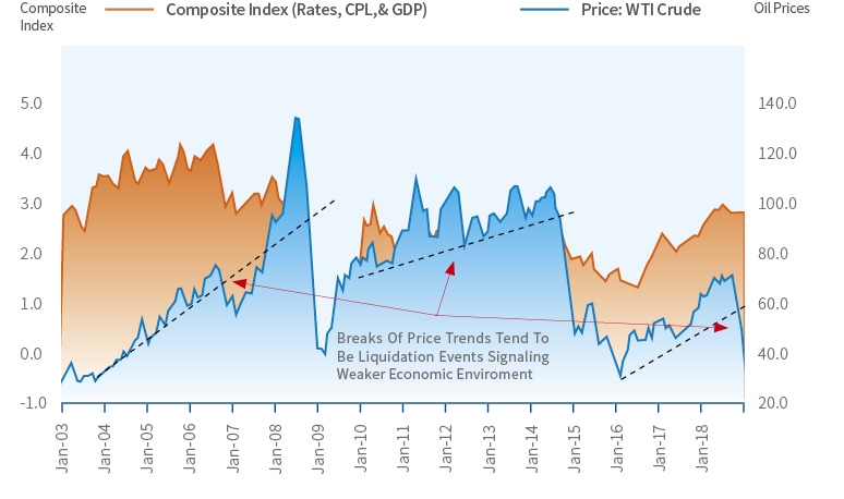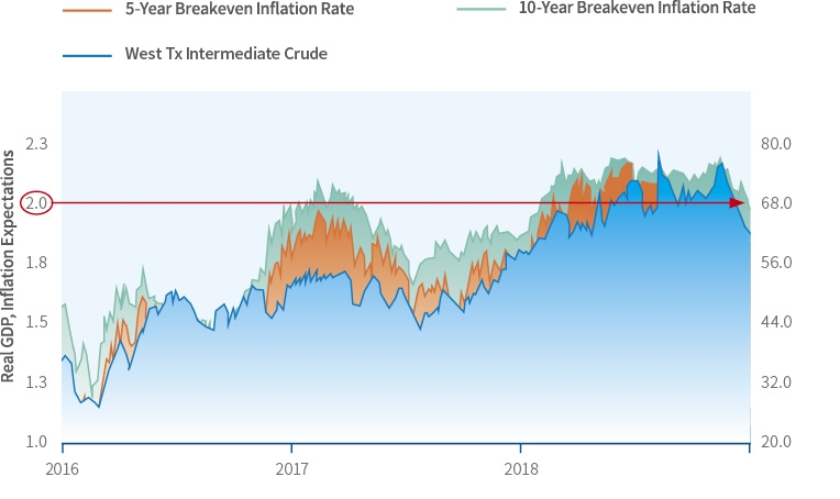 圖1 (數據來源:美聯儲) 低油價真的好嗎? 作為國際合作的中心商品,原油價格對世界經濟的影響一直是一個頗具爭議的話題。一般認為,高油價導致經濟增速下降、引起通貨膨脹等,歷史上的數次石油危機都對世界經濟產生了深遠的負面影響。但反過來,低油價就真的好嗎?畢竟從近幾年世界經濟走勢來看,原油價格持續走低,世界經濟形勢并未因此好轉,依然面臨很大的下行風險。 以下論述皆以美國為例。圖1對比了一項復合指標(綜合利率、通貨膨脹率和GDP三項指標)與WTI原油價格的相關性。從圖中可以看出,油價波動趨勢與經濟走勢有非常明顯的正向相關性,油價的上漲/下跌與經濟指標的上漲/下跌基本同步。 圖2是美國5年和10年通脹率臨界點和油價的對比。從圖中也可以看出,油價波動與通貨膨脹率的波動基本一致。核心通脹率超過2%的紅線,一直是美聯儲加息的最重要心理關口。在2018年的大多數時間里,原油價格持續走高,美國5年和10年通脹率高于2%,就業和通脹持續向好,美聯儲對美國經濟增長持樂觀態度,先后4次加息。 換言之,在經濟持續低迷、亟待刺激的現狀下,油價上漲往往是石油需求增加、經濟趨勢向好的表現;反之,油價持續下跌則可能預示著經濟提振乏力,甚至可能進入通貨緊縮狀態,而這是經濟學家們最不愿看到的。對他們而言,通貨緊縮比通貨膨脹更加可怕,一旦經濟進入通縮階段,能夠采取的有效調節手段少之又少。