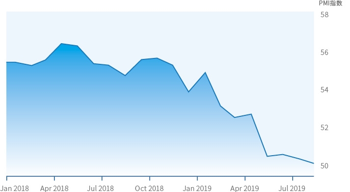 圖3:WTI走勢(來源:Trading Economics) 自我實現的寓言 因油價暴跌引發的對經濟衰退或者通貨緊縮的擔憂,已引起部分國家和國際組織的關注。2018年12月3日,加拿大阿爾伯塔省宣布原油生產削減日均32.5萬桶,此次減產計劃的削減幅度超過石油輸出國組織(OPEC)三個最小的成員國——赤道幾內亞、加蓬和剛果共和國的總產量;12月7日,歐佩克會議結束,達成OPEC+減產120萬桶/日的協議。 2019年,世界經濟動能趨弱,油價亦是“跌跌不休”,背后反映了人們對經濟衰退的擔憂。人們對經濟衰退的擔憂影響原油價格走勢,低位徘徊的原油價格再反過來進一步加深人們的擔憂,這是一個典型的“自我實現”的寓言。 今年1-8月份,世界主要經濟體美國和歐元區皆錄得較低的通脹率。以美國為例,經濟增長放緩,年初至今的通脹率皆低于2%,且與原油價格走勢(WTI)基本契合(圖3)。 低油價對美國經濟的負面影響,正在逐漸顯現。隨著原油自高位下挫,美國制造業PMI亦持續下滑至榮枯線水平,經濟增長活力隨之減弱(圖4)。 中國是原油進口大國,對外依存度很高。中國原油期貨自2018年3月26日開市以來,價格走勢與WTI和布倫特期貨基本吻合。上海期貨交易所數據顯示,中國原油期貨與布倫特期貨的相關性高達93.1%。雖然在過往幾次石油危機中,高企的石油價格沒有給中國經濟高速發展帶來過多負面影響,但在當前嚴峻的國際形勢下,我國經濟面臨的挑戰和困難不言而喻。低油價伴隨疲弱的經濟形勢,更需要提高風險意識,防范經營風險。