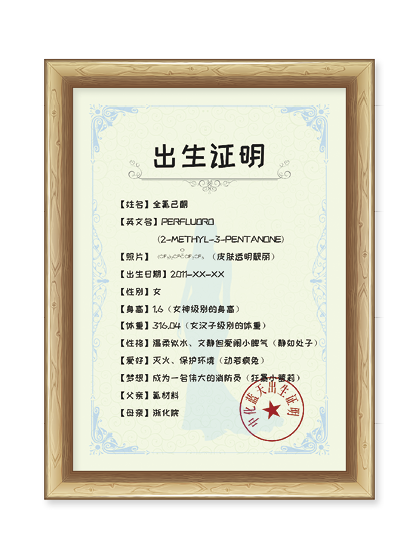 頓安是個(gè)大家庭,“大哥”哈龍1211、哈龍1301,打破國外壟斷;“二哥”HFC-227ea、HFC-236fa,領(lǐng)跑滅火劑領(lǐng)域;我是頓安1230 ,全球也是寥寥無幾。今天,我想做個(gè)自我介紹。 Hello Everyone,我叫“酮酮”,學(xué)名叫全氟己酮,這是一張貨真價(jià)實(shí)的出生證。