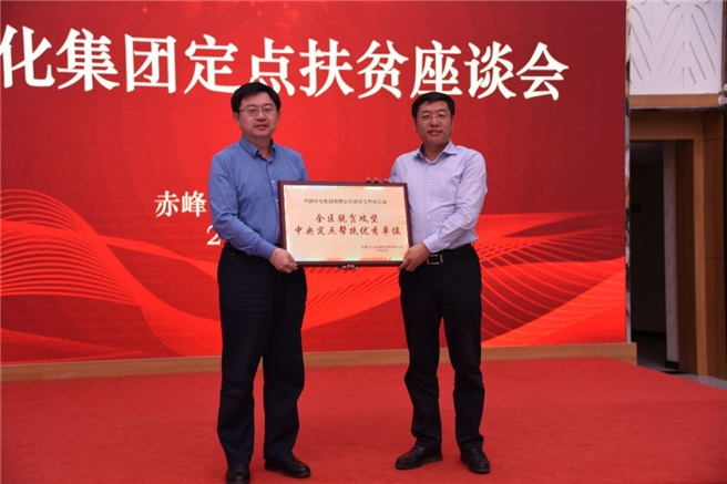 中化集團(tuán)獲內(nèi)蒙古自治區(qū)“全區(qū)脫貧攻堅(jiān)中央定點(diǎn)幫扶優(yōu)秀單位”榮譽(yù) 9月27日下午,寧高寧一行與內(nèi)蒙古自治區(qū)扶貧辦、赤峰市及林西縣、阿旗黨委政府相關(guān)領(lǐng)導(dǎo)進(jìn)行座談。會(huì)議由赤峰市副市長汪國森主持,林西縣委副書記、縣長付守利和阿旗旗委副書記、旗長孟曉冰分別介紹了兩地經(jīng)濟(jì)社會(huì)發(fā)展、脫貧攻堅(jiān)工作及中化定點(diǎn)扶貧工作開展情況。內(nèi)蒙古自治區(qū)扶貧辦副主任趙輝對中化集團(tuán)近年在定點(diǎn)扶貧工作領(lǐng)域取得的突出成效給予高度評價(jià)并表示衷心感謝,希望中化集團(tuán)在脫貧攻堅(jiān)決勝階段對赤峰市兩地繼續(xù)予以大力支持,確保脫貧攻堅(jiān)任務(wù)全面勝利完成。會(huì)上,自治區(qū)扶貧辦為中化集團(tuán)頒發(fā)了“全區(qū)脫貧攻堅(jiān)中央定點(diǎn)幫扶優(yōu)秀單位”獎(jiǎng)牌。