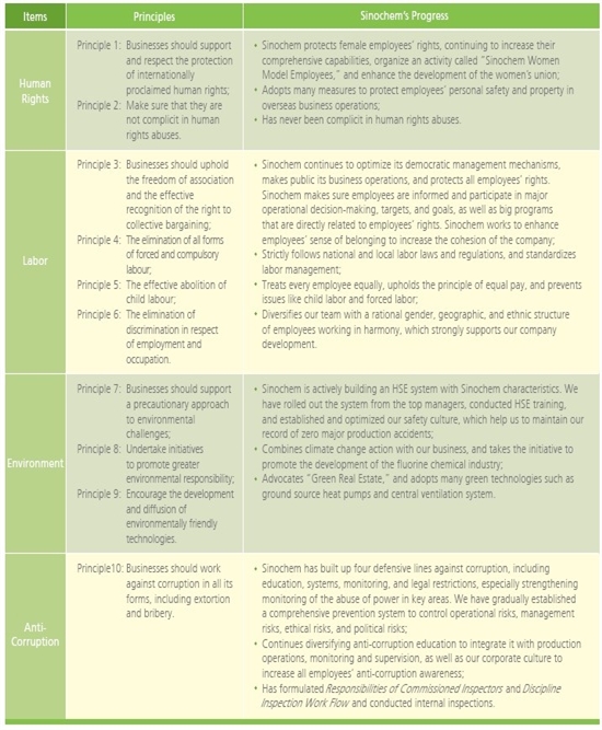 Sinochem is a member of the United Nations Global Compact (UNGC). Starting in 2010, Sinochen has started delivering its statement of progress toward the UNGC principles. In August of 2010, given the important nature of the company's CSR report in communicating stakeholder information and progress toward meeting UNGC principles, Sinochem CSR Report 2009 won the 2010 UNGC "Chinese CSR Model Report Special Style" award.