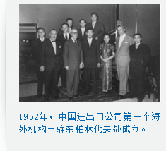 1952年4月3—12日在莫斯科召開的國際經濟會議,對反“封鎖”“禁運”產生了一定影響。中國代表團成員中國進出口公司盧緒章經理參會期間,同30個國家和地區的100余位工商人士進行廣泛接觸,并與英、法、西德等11個國家和地區的客戶簽訂了總額達2億多美元的貿易協議和合同。同年夏天,公司在東柏林設立代表處,作為我國對外貿易的窗口,開始逐步建立與西歐國家的貿易關系。