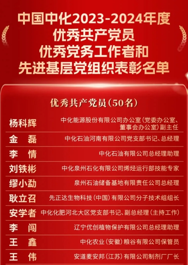 2023年以來,中國中化各級黨組織和廣大共產黨員堅持以習近平新時代中國特色社會主義思想為指導,全面貫徹落實黨的二十大精神,深入開展學習貫徹習近平新時代中國特色社會主義思想主題教育,聚焦公司改革發展和黨的建設,在科技創新、提質增效、扭虧治困、合規經營、安全生產、重大項目建設等重點任務中,充分發揮黨組織戰斗堡壘作用和黨員先鋒模范作用,涌現出一大批先進典型。中國中化黨組決定對公司100個先進集體和個人進行表彰,授予中國中化“兩優一先”榮譽稱號。